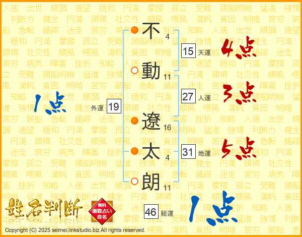 不(4画)動(11画) 遼(16画)太(4画)朗(11画)