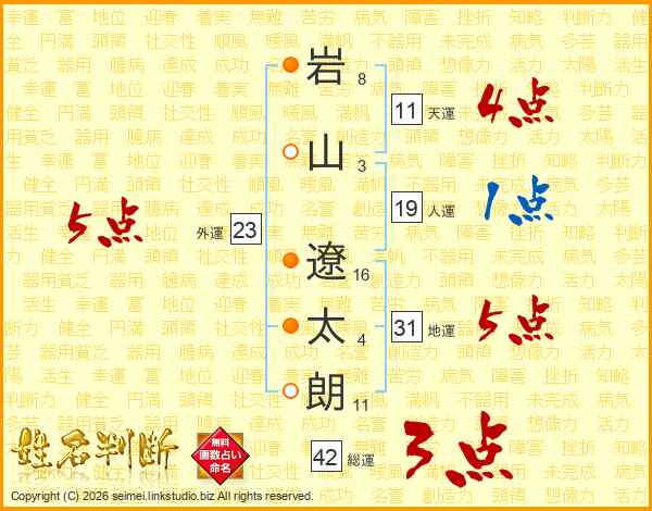 岩(8画)山(3画) 遼(16画)太(4画)朗(11画)
