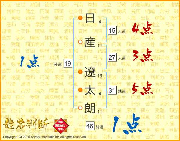 日(4画)産(11画) 遼(16画)太(4画)朗(11画)