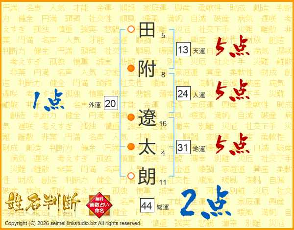 田(5画)附(8画) 遼(16画)太(4画)朗(11画)
