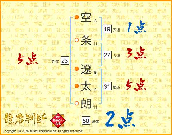 空(8画)条(11画) 遼(16画)太(4画)朗(11画)