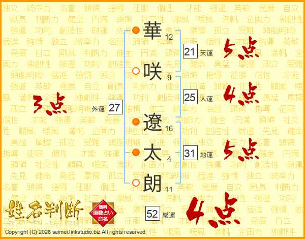 華(12画)咲(9画) 遼(16画)太(4画)朗(11画)