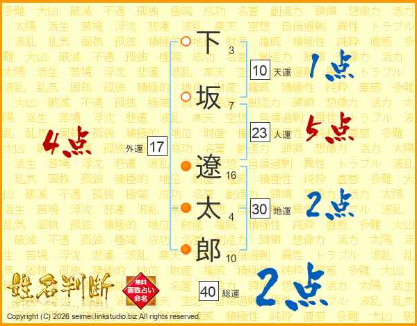下(3画)坂(7画) 遼(16画)太(4画)郎(10画)