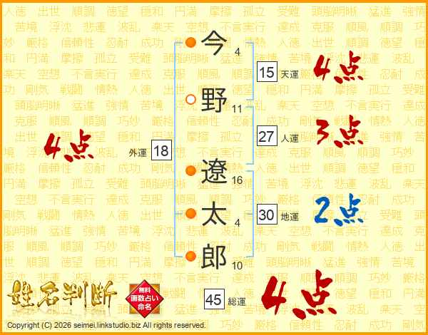 今(4画)野(11画) 遼(16画)太(4画)郎(10画)