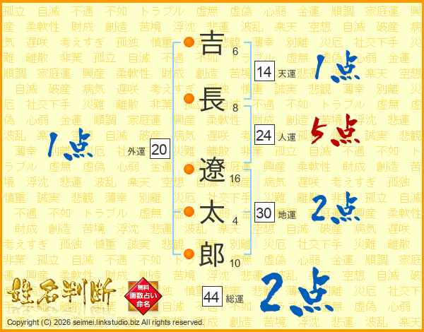 吉(6画)長(8画) 遼(16画)太(4画)郎(10画)