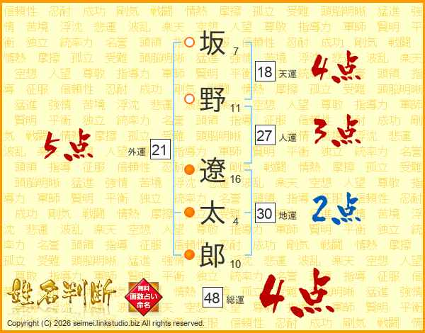 坂野遼太郎さんの総運は48画の4点!