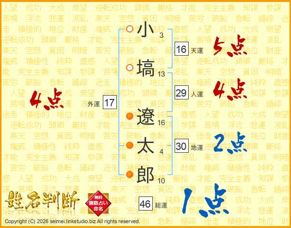 小(3画)塙(13画) 遼(16画)太(4画)郎(10画)