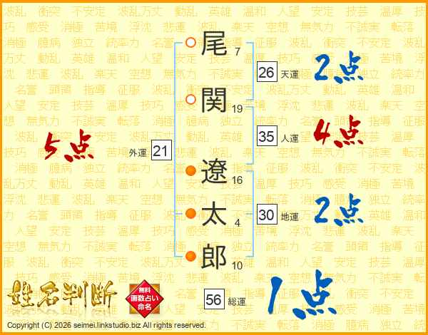 尾(7画)関(19画) 遼(16画)太(4画)郎(10画)