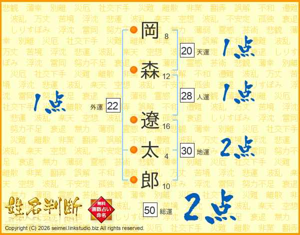 岡(8画)森(12画) 遼(16画)太(4画)郎(10画)