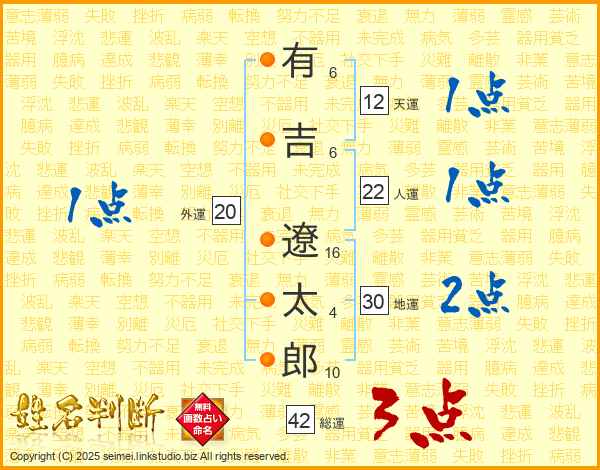 有(6画)吉(6画) 遼(16画)太(4画)郎(10画)