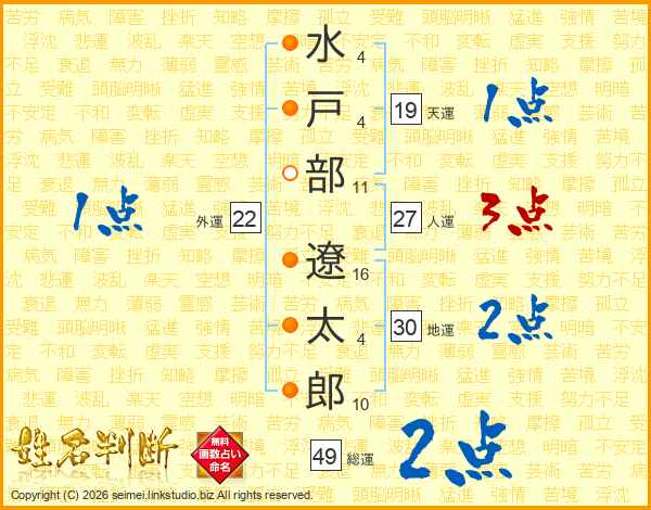 水(4画)戸(4画)部(11画) 遼(16画)太(4画)郎(10画)
