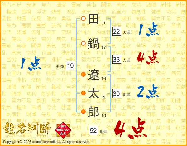 田鍋遼太郎さんの総運は52画の4点!
