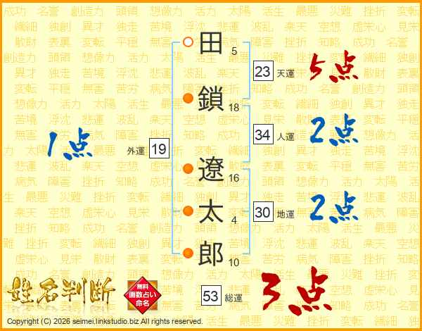 田(5画)鎖(18画) 遼(16画)太(4画)郎(10画)