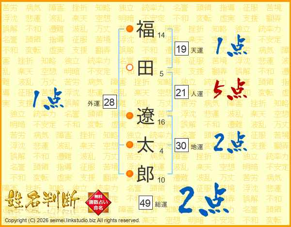 福(14画)田(5画) 遼(16画)太(4画)郎(10画)