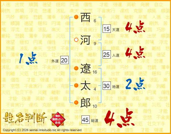 西(6画)河(9画) 遼(16画)太(4画)郎(10画)