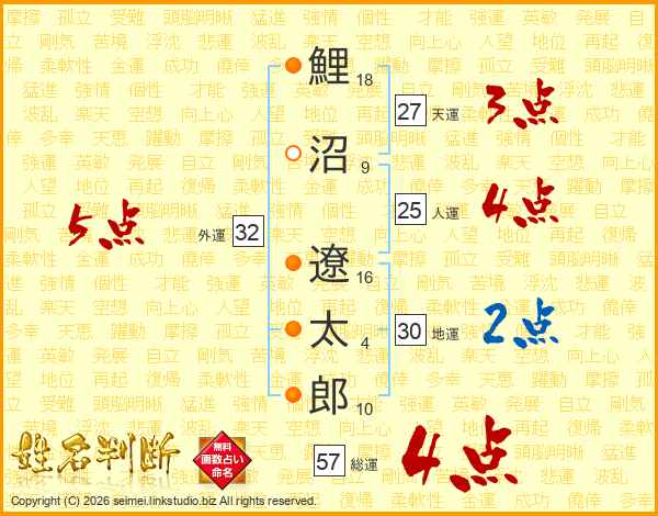 鯉(18画)沼(9画) 遼(16画)太(4画)郎(10画)