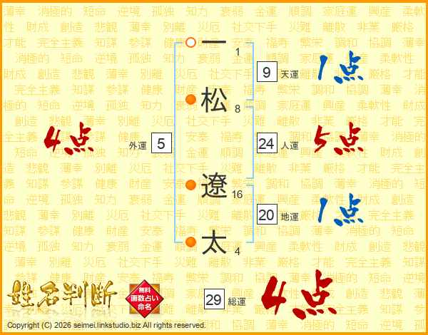生活面を象徴する運勢です。外部から受ける影響力を表し、結婚運、家庭運や職場、環境への順応性を表します。総運から人運を引いた画数。姓や名が1文字の場合を除く。