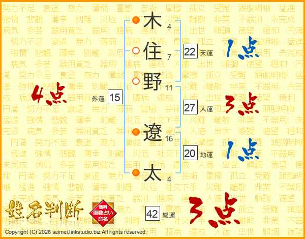 木(4画)住(7画)野(11画) 遼(16画)太(4画)