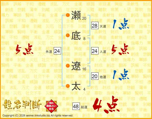 瀬底遼太さんの総運は48画の4点!