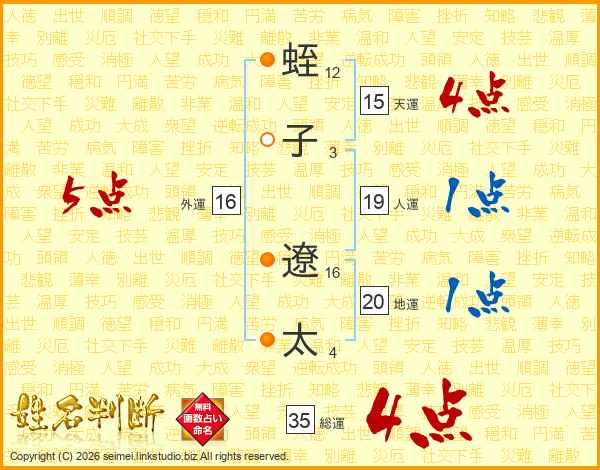 蛭(12画)子(3画) 遼(16画)太(4画)