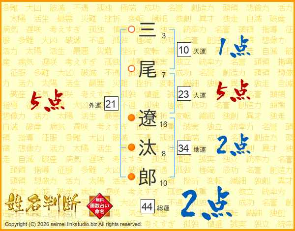 三(3画)尾(7画) 遼(16画)汰(8画)郎(10画)