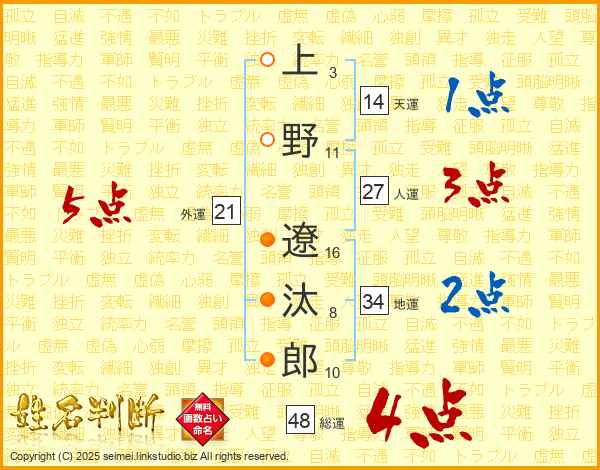 上(3画)野(11画) 遼(16画)汰(8画)郎(10画)