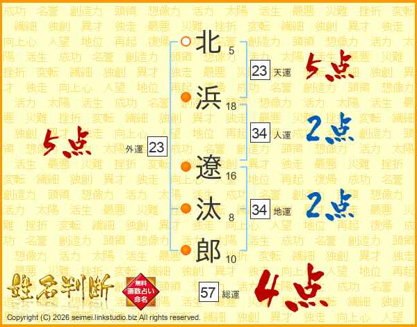 北(5画)浜(18画) 遼(16画)汰(8画)郎(10画)