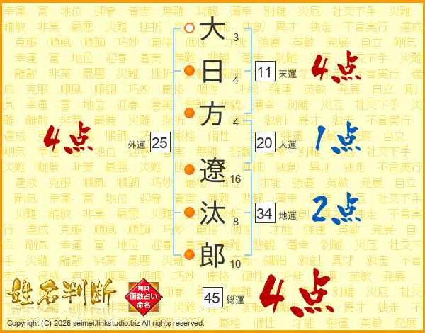 大(3画)日(4画)方(4画) 遼(16画)汰(8画)郎(10画)