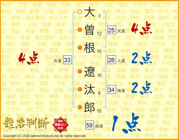 大曽根遼汰郎さんの人運は26画の2点!