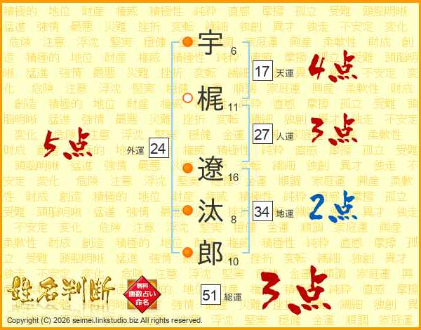 宇梶遼汰郎さんの総運は51画の3点!
