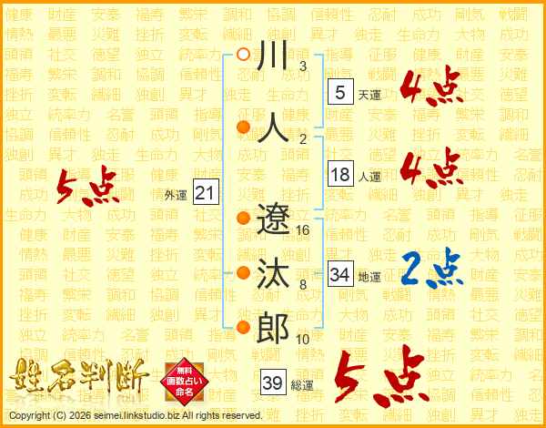 川(3画)人(2画) 遼(16画)汰(8画)郎(10画)