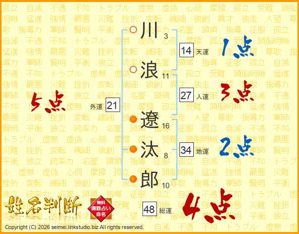 川(3画)浪(11画) 遼(16画)汰(8画)郎(10画)