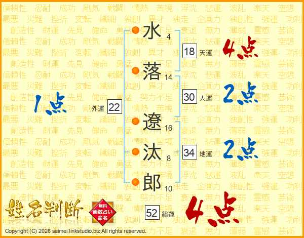 水(4画)落(14画) 遼(16画)汰(8画)郎(10画)