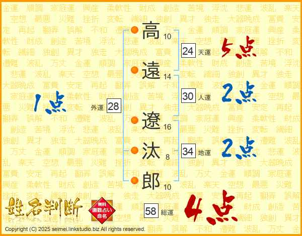 高(10画)遠(14画) 遼(16画)汰(8画)郎(10画)