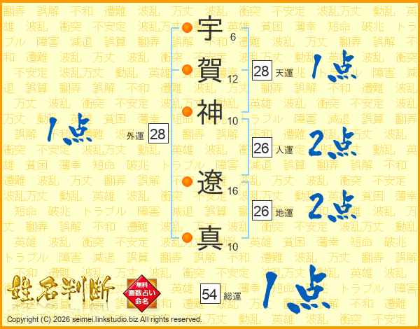 宇(6画)賀(12画)神(10画) 遼(16画)真(10画)