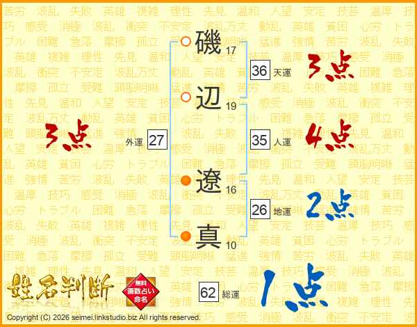 磯(17画)辺(19画) 遼(16画)真(10画)