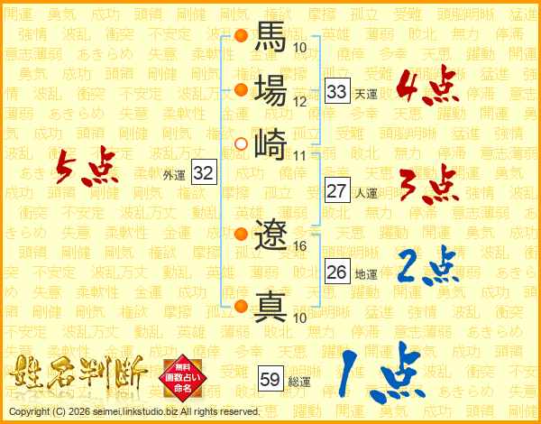 馬(10画)場(12画)崎(11画) 遼(16画)真(10画)
