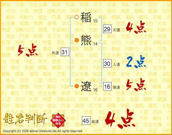 稲熊遼さんの総運は45画の4点!