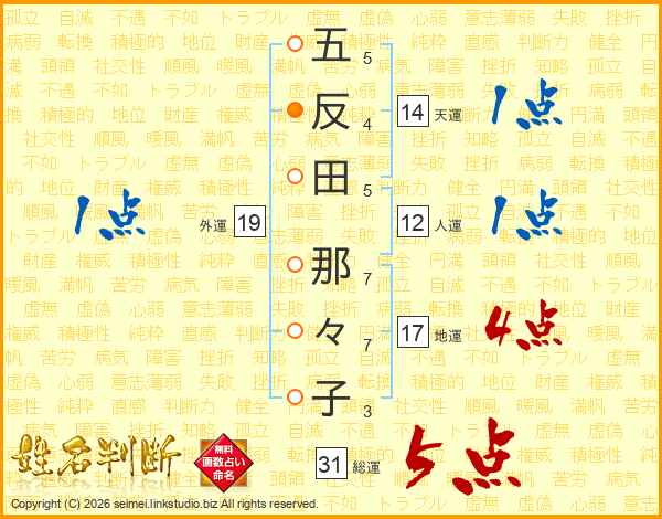 生活面を象徴する運勢です。外部から受ける影響力を表し、結婚運、家庭運や職場、環境への順応性を表します。総運から人運を引いた画数。姓や名が1文字の場合を除く。