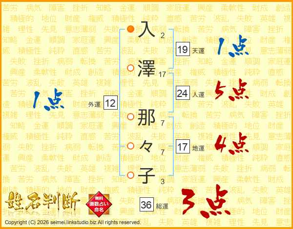 入(2画)澤(17画) 那(7画)々(7画)子(3画)