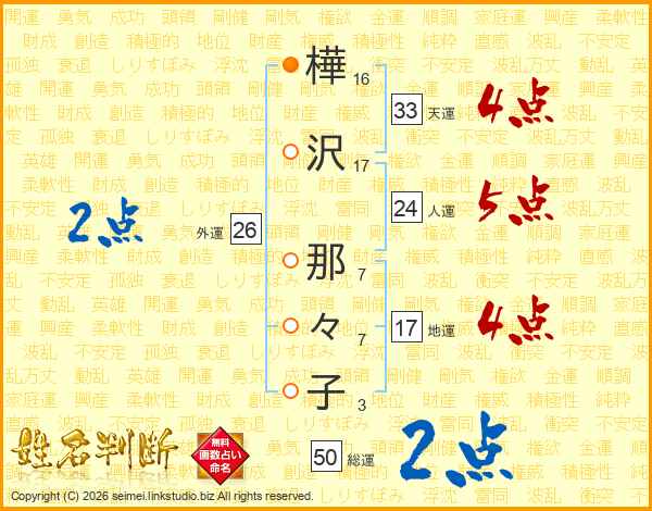 樺(16画)沢(17画) 那(7画)々(7画)子(3画)