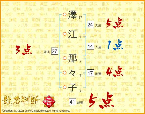 澤江那々子さんの総運は41画の5点!