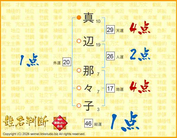 真(10画)辺(19画) 那(7画)々(7画)子(3画)