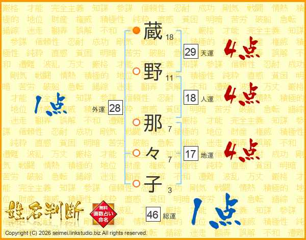 蔵(18画)野(11画) 那(7画)々(7画)子(3画)