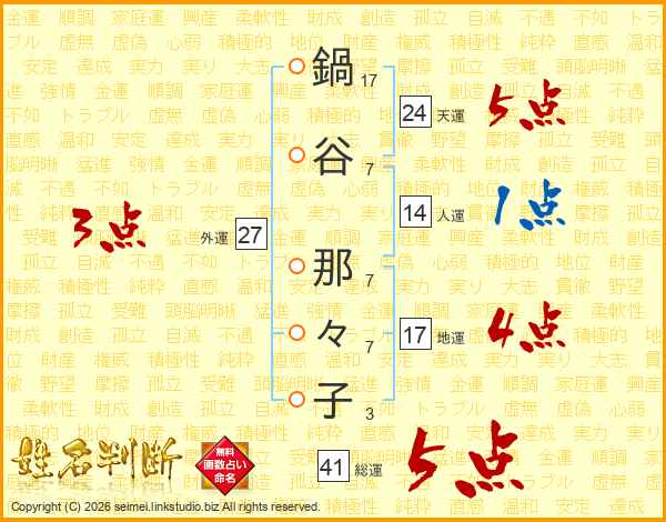 鍋谷那々子さんの総運は41画の5点!