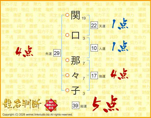 関(19画)口(3画) 那(7画)々(7画)子(3画)