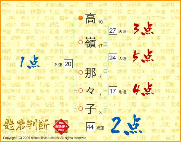 高(10画)嶺(17画) 那(7画)々(7画)子(3画)