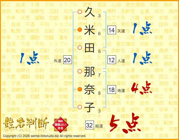 久(3画)米(6画)田(5画) 那(7画)奈(8画)子(3画)