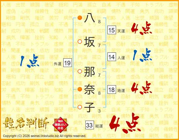 八坂那奈子さんの総運は33画の4点!