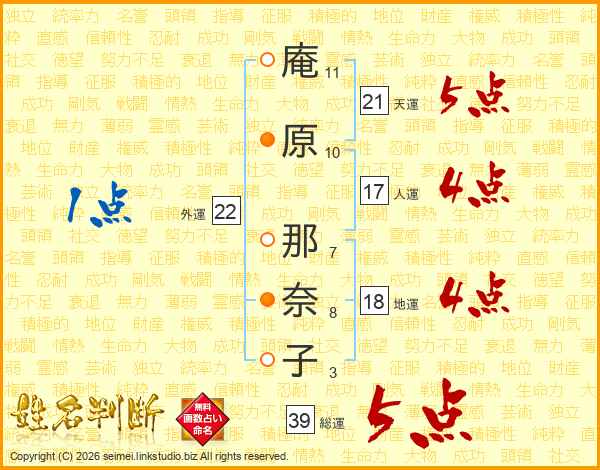 庵(11画)原(10画) 那(7画)奈(8画)子(3画)